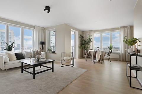 Det välutrustade köket är en dröm för varje matälskare, med moderna vitvaror inklusive diskmaskin, dubbla rostfria kyl/frys, utdragbar fläktkåpa, induktionshäll och varmluftsugn. Här finns också generösa arbetsytor som gör matlagningen till en fröjd. Vardagsrummet bjuder på rikligt med ljus och har en direkt utgång till den mysiga balkongen, där du kan njuta av solens strålar från öst och söder på den generösa ytan om cirka 8 kvm.