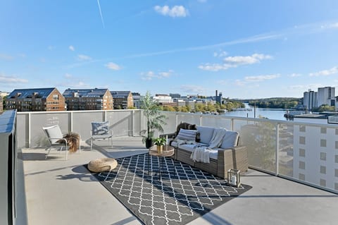 Det praktiskt planerade köket har gott om förvaringsmöjligheter samt plats för matbord med utsikt över vattnet. Vardagsrummet är lättmöblerat och har utgång till terrassen där du kan njuta av den fantastiska utsikten mot Bällstaviken. Lägenheten har tre bra sovrum som ligger bredvid varandra. Dessutom finns det ett rymligt badrum utrustat med tvättmaskin och torktumlare.
