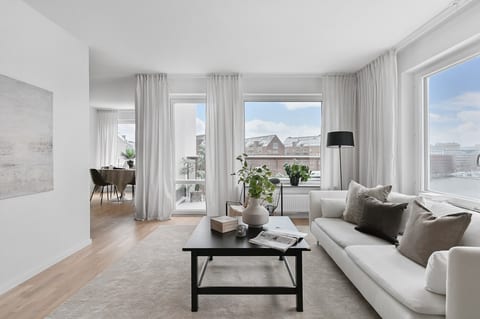 Vardagsrum och kök i halvöppen planlösning och utgång till balkong i sydväst. Det praktiskt planerade köket har gott om förvaringsmöjligheter samt matplats med utsikt över vattnet. Vardagsrummet är ljust och lättmöblerat med fönster i två väderstreck och plats för både soffgrupp och matbord. Lägenheten har fyra bra sovrum och två rymliga badrum med dusch varav det ena är utrustat med tvättmaskin och torktumlare. Det finns gott om plats för förvaring i två klädkammare och bakom skjutdörrar av spegelglas i hallen.