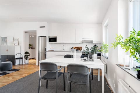 Bostaden erbjuder öppna sociala ytor mellan kök och vardagsrum, köket rymmer gott om förvaring och här finns naturlig plats för matsalsbord. Vardagsrumsdelen är lättmöblerad tack vare flera bra väggar och skapar en avskild känsla.