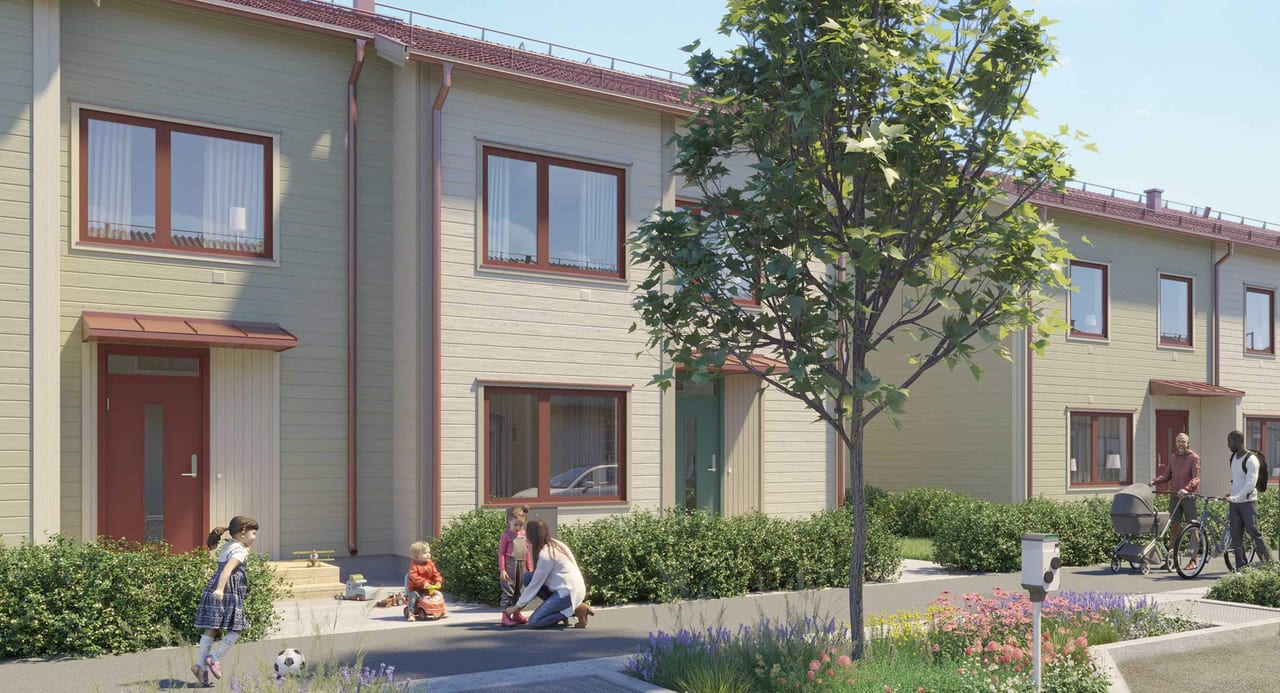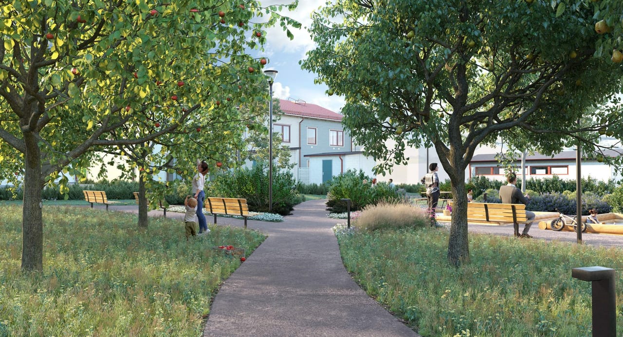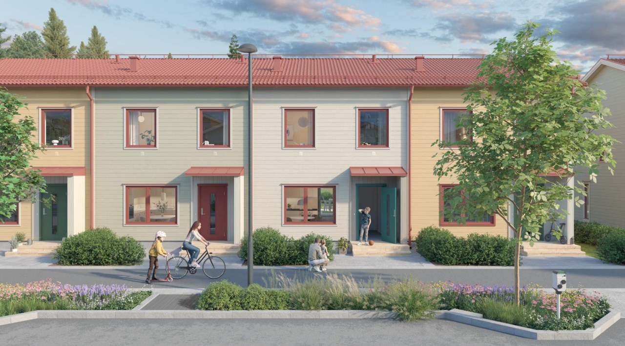 I den södra delen av Kareby Äng runt en grönskande gård med fruktträd och lekplats bygger vi 26 radhus på 101, 121 och 123 kvadrat. Alla med minst 4 rum i två plan med egen uteplats och en lättskött trädgård med utsikt över gården och lekplatsen. Här kan barnen springa fritt och leka med kompisar medan du kopplar av med en kopp kaffe på din uteplats.