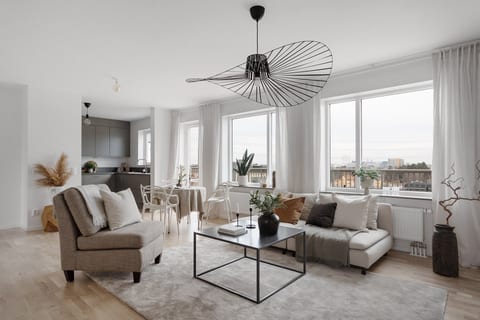 Högst upp i huset med stor privat terrass i söder finns denna genomgående trerummare. Bostaden har öppna sociala umgängesytor med möjlighet till ett mer avskilt kök om så önskas. Två sovrum varav det ena med intilliggande mindre rum att använda som separat arbetsrum eller lyxig klädkammare. I badrummet finns duschhörna bakom vikbara glasväggar, handfat med kommod samt tvättmaskin och torktumlare med bänkskiva och överskåp. Genomgående gott om förvaring i skjutdörrsgarderober, klädkammare och tillhörande förråd. Varmt välkommen på visning!