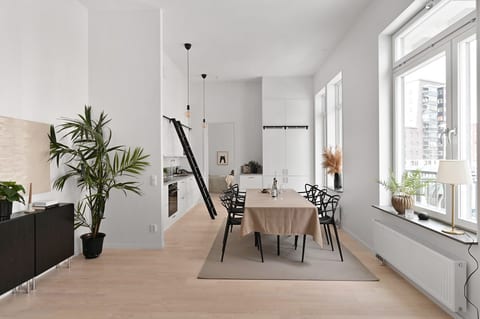 Välkommen till en unik och välplanerad trea där de flesta rum har en takhöjd om ca 3,5 meter som tillsammans med stora fönsterpartier ger bostaden en härlig känsla av ljus och rymd. Planlösningen bjuder in till umgänge tack vare den öppna sociala planlösningen mellan kök och vardagsrum. Här finns gott om plats för soffgrupp och ett större middagsbord och på sommarhalvåret kan man även umgås på den möblerbara balkongen som nås härifrån.