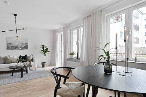 I den delvis öppna planlösningen mot köket ligger det rymliga vardagsrummet, som erbjuder gott om utrymme för en stor soffa och tillhörande möbler. Här finns även plats för en arbetsplats för den som behöver en studiehörna. Från vardagsrummet når du den härliga uteplatsen, som är privat belägen in mot innegården och erbjuder avkopplande stunder i solen.