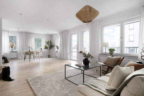Välkommen till denna ljusa och socialt planerade bostad med ett vardagsrum om ca 40 kvm och fönster i två väderstreck. Här finns också en rymlig balkong i västerläge och till bostaden hörande parkeringsplats i garage. Köket är öppet mot vardagsrummet med en bardisk och det är väl utrustat med ugn och mikro i högskåp, dubbla kyl-/frysskåp, integrerad diskmaskin samt induktionshäll. I hallen finns plats för avhängning på hatthylla och i garderob, här finns också en större klädkammare och ett städskåp. Bostaden erbjuder två helkaklade badrum varav det ena har tvättmaskin och torktumlare med arbetsbänk och överskåp samt två bra sovrum.